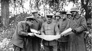 Le Kronprinz bavarde avec un brancardier – Des officiers étudient une carte d'un secteur