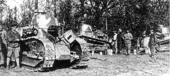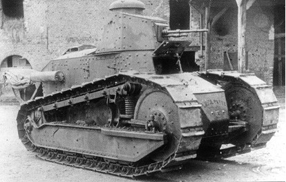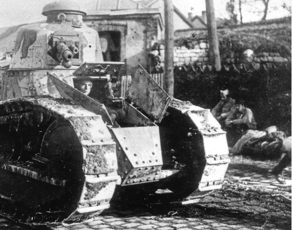 Durant l'opération Blucher-Yorck, les Français ne s'attendaient pas à être repoussés aussi facilement. Alors que l'infanterie française se repositionne sur la Marne le 29 Mai, les chars Renault se portent à la rencontre des Allemands deux jours plus tard. Ces engins font partie d'un premier régiment blindé français créé le 18 Mai. Ce sont majoritairement des chars Renault FT-17 produits en trois versions: la première, qui est armée d'une mitrailleuse; la seconde armée d'un petit canon de 37mm; et la troisième qui est en fait un véhicule de communication. Ces chars ont été adoptés par l'armée française à l'été 1917 à la suite d'une vive polémique quant au choix d'un modèle qui soit le meilleur compromis du moment entre la propulsion, la protection et l'armement. Pétain passe tout de go une commande de 3500 exemplaires, sans s'informer si la firme Renault peut en produire un aussi grand nombre dans un délai raisonnable. Une répartition de la production chez quatre sous-contractants permettra au général d'en obtenir livraison pour le début du mois de Mai. L'aspect du char Renault annonce celui des chars d'assaut à venir. Il est plus petit et compact que le St-Chamond et le Schneider avec leurs formes carrées – pour ne rien dire de la série des chars Mark britanniques. C'est le premier char muni d'une tourelle pivotante digne de ce nom. Elle est soit ronde ou octogonale et montée sur billes afin d'être pivotée par la simple pression du corps du tireur. Les chenilles sont montantes et débordent vers l'avant. Le caisson est composé de plaques de blindages solides et il est conçu pour loger deux équipiers: le chauffeur et le mitrailleur. La suspension est assurée par des ressorts à lames sur deux balanciers dont les extrémités portent sur quatre boggies munies de roues s'appuyant sur les rails de la chemille. Ce système assure une pression uniforme répartie sur chaque galet de roulement. Le but recherché est un engin qui soit le plus léger possible et capable d'agir partout où va l'infanterie. Il se doit être plus facile à produire rapidement. Les Américains se montrent intéressés par le char Renault, et ils en équiperont également leurs premières unités blindées.
