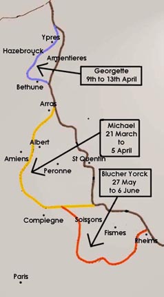 En revanche, l'attaque des Flandres vers le Pas-de-Calais est plus attrayant, parce qu'elle offre des avantages stratégiques et psychologiques. Le kronprinz Rupprecht propose une attaque à partir de Lille vers Dunkerque et Calais (opération Georges). Si cette opération réussit, les Britanniques seront directement menacés chez eux. Le seul ennui vient de la nature détrempée du terrain souvent boueux et préalablement labourée par les obus (Paschendaele) interdit une telle attaque avant le début de Mai. Qui plus est, la zone des Flandres engrange l'essentiel des forces britanniques. Le troisième scénario présenté est celui d'une attaque sur la Somme, la ou les unités britanniques sont les plus dispersées et plus récemment déployées. Aux yeux des Allemands, les Brits demeurent l'adversaire principal à écraser. Le Parlement allemand estime que l'Angleterre sera mieux disposée à capituler si ses soldats se font moucher sévèrement et non pas son allié français. La décision est prise rapidement le 24 Janvier 1918: ce sera la Somme (opération Michael) avec ses trois attaques complémentaires qui auront pour but de couper et isoler les forces britanniques et françaises. L'attaque principale frappera l'aile droite du front britannique, ce qui lui permettra de débouler sur un terrain relativement favorable à une offensive. La raison étant que les plateaux de Cambrésis et de Vermandois offrent un sol solide en toute saison et permettent la création de saillants pour encercler l'ennemi. La reconnaissance photographique aérienne a montré que les défenses alliées sont très faibles et éparses. En bref, cogner sur les Brits pour commotionner psychologiquement les Français en leur évitant de monter en ligne: l'ennemi sera coupé en deux et définitivement battu. Pour réussir, il importe que les unités allemandes maintiennent les forces françaises et britanniques séparées.