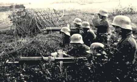 Un Tommy avec sa mitrailleuse légère Lewis – Un groupe de fantassins allemands