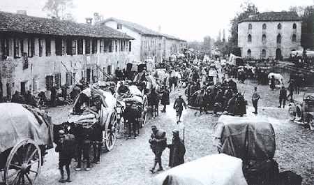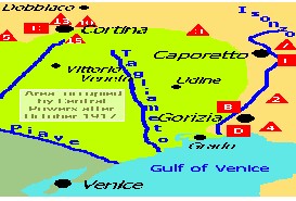 Le 27, la 3ème Armée italienne toute entière était menacée d'encerclement près de Carso. Le général Cadorna ordonne à ses forces de se replier sur la rivière Tagliamento. L'ennemi occupe toutes les hauteurs et fait pleuvoir obus et projectiles de mortiers sur les Italiens. La plaine de Vénétie est menacée d'invasion, alors que 1,5 millions de soldats italiens poursuivent leur retraite en bon ordre. Pour protéger la retraite, deux armées (la 3ème avec ses 300,000 hommes et la 4ème avec ses 230,000 hommes) parviennent à ralentir la progression austro-allemande, mais perdent 25% de leurs effectifs – comme les 90,000 soldats déployés près de Carnia encerclés et tous faits prisonniers... La plaine de Vénétie est occupée le 30 Octobre, et les attaquants disposent désormais de bonnes routes pour continuer leurs progressions. Pis encore, de nombreux soldats italiens se mutinent et plusieurs furent exécutés. Parfois, les pelotons d'exécution préféraient fusiller leurs officiers plutôt que les mutins (ci-bas à droite)...